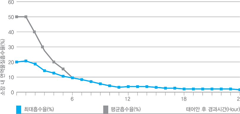±×¸®°í ¸é¿ª¹°ÁúÀ» Èí¼öÇÒ ¼ö ÀÖ´Â ¼Û¾ÆÁöÀÇ ¼Òȱâ°ü³» Èí¼ö´É·Âµµ ½Ã°£ÀÌ Áö³²¿¡ µû¶ó ¶³¾îÁö°Ô µÇ´Âµ¥, ÀϹÝÀûÀ¸·Î ¼Û¾ÆÁöÀÇ ¼ÒÀå¿¡¼ÀÇ Èí¼ö ´É·ÂÀº Ãâ»ý ½Ã¿¡ °¡Àå ³ôÀ¸¸ç, »ýÈÄ 6½Ã°£±îÁö´Â Èí¼ö ´É·ÂÀÌ ³ôÀ¸³ª, 20½Ã°£Â°ÀÇ Èí¼öÀ²Àº 4~10%·Î ¶³¾îÁö°í 3ÀÏ °æ°ú ÈÄ¿¡´Â ¾ÆÁÖ ¹Ì¾àÇØÁý´Ï´Ù.