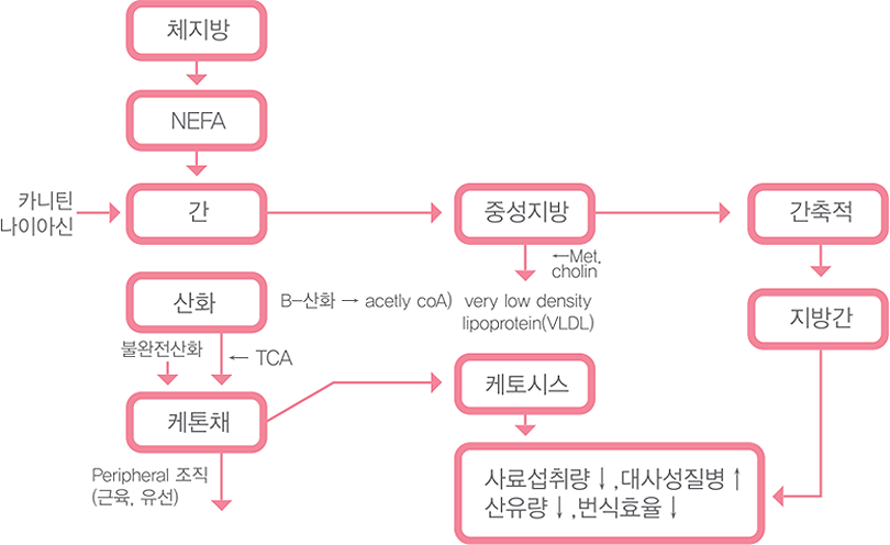 »óÅ´ ºÒ±ÕÇüÀ» ÀÌ·ç°Ô µÇ¸ç, ƯÈ÷ ºÐ¸¸Á÷ÈÄ¿¡ ÀÌ·¯ÇÑ ¿µ¾ç ºÒ±ÕÇüÀÌ ½É°¢ÇÑ »óŰ¡ µÇ¿© Ç÷Áß ±Û¸£ÄÚ½º ÇÔ·®ÀÌ °¨¼ÒÇÏ°í ¹Ý¸é¿¡ Ç÷Áß À¯¸®Áö¹æ»ê(NEFA) ¹× ÄÉÅæÀÇ ÇÔ·®ÀÌ ÇöÀúÇÏ°Ô Áõ°¡ÇÏ°Ô µË´Ï´Ù. Ç÷Áß Áö¹æ»ê ÇÔ·® Áõ°¡´Â »êÀ¯Ãʱ⠺ÎÁ·ÇÑ ¿¡³ÊÁö¸¦ º¸ÃæÇϱâ À§ÇØ Ã¼Áö¹æÀÌ µ¿¿øµÇ±â ¶§¹®ÀÔ´Ï´Ù. ºÐ¸¸½Ã Ç÷Áß NEFA ³óµµ´Â º¸Åë ºÐ¸¸ Àü¿¡ ºñÇØ 3¹è Á¤µµ Áõ°¡ÇÕ´Ï´Ù. ÀÌ NEFA´Â °£Àå¿¡¼ ¿¡³ÊÁö¿Í ¾Æ¼¼Æ®»êÀ¸·Î ¹Ù²î´Âµ¥, ÀÌ ¾Æ¼¼Æ®»êÀº °£Àå³»¿¡ ÀÌ¿ë °¡´ÉÇÑ ÇÁ·ÎÇǿ»êÀÌ ÀÖ´Ù¸é ¾Æ¼¼Æ®»êÀº ¿¡³ÊÁö·Î ¹Ù²îÁö¸¸ ÀÌ¿ë °¡´ÉÇÑ ÇÁ·ÎÇǿ»êÀÌ ¾øÀ» ¶§´Â ¾Æ¼¼Æ®»êÀÌ ÄÉÅæÃ¼(¾Æ¼¼Åæ, ¾Æ¼¼Å侯¼¼Å×ÀÌÆ®, º£Å¸-ÇÏÀ̵å·Ï½ÃºäÆ¿·¹ÀÌÆ®)·Î ¹Ù²î¾î Ç÷¾×À¸·Î µé¾î°¡¼ ³ú¿¡¼ »ç·á¼·Ã븦 Àû°Ô Çϵµ·Ï ¸Þ½ÃÁö¸¦ º¸³À´Ï´Ù.