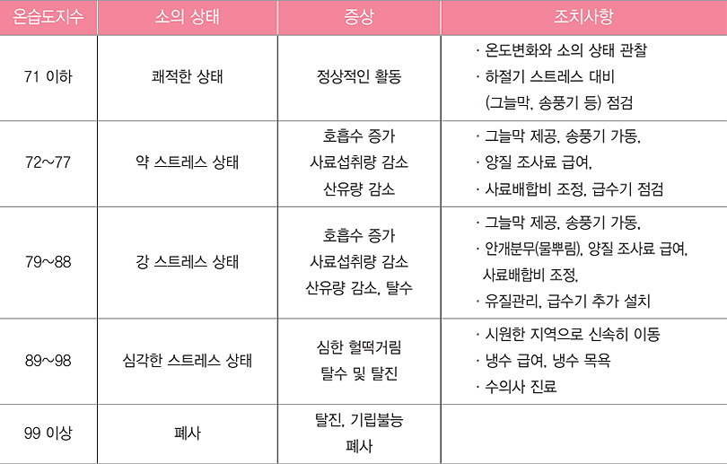 Á¥¼Ò¿¡°Ô ¿µÇâÀ» ÁÖ´Â °í¿Â½ºÆ®·¹½º¸¦ ÆÇ´ÜÇÏ´Â ±âÁØÀ» ¿Â½ÀµµÁö¼ö(Temperature-Humidity Index, THI) ¶Ç´Â ºÒÄèÁö¼ö¶ó°í ÇÕ´Ï´Ù. Áï ¿Âµµ¿Í ½ÀµµÀÇ »ó°ü°ü°è¸¦ ÀÌ¿ëÇÏ¿© Áö¼ö½Ä¿¡ ÀÇÇÑ °è»êÀ» ÅëÇØ ¼öÄ¡·Î ³ªÅ¸³½ °ÍÀ¸·Î ¿Ü±¹¿¡¼´Â °¡ÃàÀÇ °í¿Â½ºÆ®·¹½º¸¦ ÃßÁ¤ÇÏ´Â ÁöÇ¥·Î¼ ³Î¸® ÀÌ¿ëµÇ°í ÀÖ½À´Ï´Ù. ¿Â½ÀµµÁö¼ö¸¦ ±¸ÇÏ´Â ½ÄÀº ´ÙÀ½°ú °°½À´Ï´Ù.