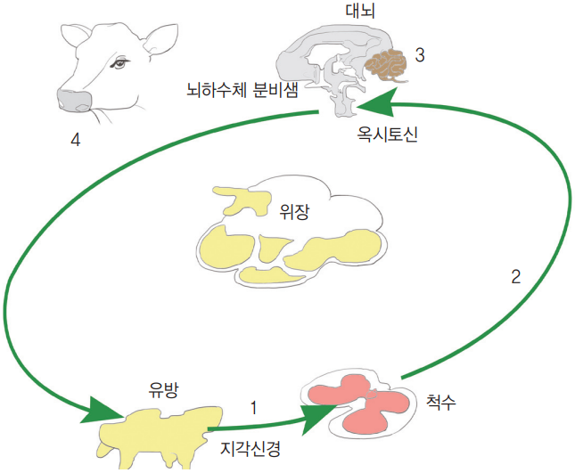 À¯ÁóÀÇ ÇϰÀº ½Å°æ°è¿Í ³»ºÐºñ°èÀÇ °øµ¿ÀÛ¿ëÀ¸·Î ÀϾÙ. Áï, ÈíÀ¯ÀÚ±ØÀ̳ª ÂøÀ¯ÀÚ±ØÀ» ºñ·ÔÇÑ ½Å°æÀÚ±ØÀÌ Ã´¼ö½Å°æÀ» Ÿ°í ½Ã»óÇϺο¡ µµ´ÞµÇ¾î ½Ã»óÇϺÎÀÇ ½Ç¹æÇÙ°ú ½Ã»è»óÇÙÀ» ÀÚ±ØÇÔÀ¸·Î¼ ¿Á½ÃÅä½Å(oytocin)ÀÇ ÇÕ¼ºÀ» ÃËÁøÇÑ´Ù. ÀÌ ¿Á½ÃÅä½ÅÀº ³úÇϼöüÈÄ¿±À¸·Î ÀÌÇàµÇ°í, ÀÌ¾î¼ Ç÷·ù ÁßÀ¸·Î ¹æÃâµÇ´Âµ¥, Ç÷·ù¸¦ µû¶ó À¯¼±À¸·Î ¿î¹ÝµÇ¾î ±Ù»óÇǼ¼Æ÷¸¦ ¼öÃà½ÃÅ´À¸·Î½á À¯ÁóÀÇ ÇϰÀ» À¯¹ßÇÑ´Ù.