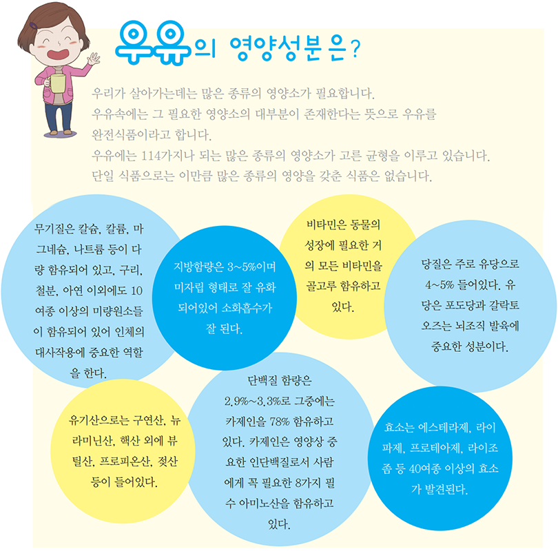 ¿ìÀ¯ÀÇ ÁÖ¿ä ¼ººÐÀº ¼öºÐ, ´Ü¹éÁú, Áö¹æ, ź¼öȹ°, ±¤¹°ÁúÀ̸ç, ±× ¿Ü¿¡ ºñŸ¹Î, »ö¼Ò, È¿¼Ò µîÀÌ Æ÷ÇԵȴÙ. ºñ·Ï ¿ìÀ¯¿¡ ÀÖ´Â °¢Á¾ ¿µ¾ç¼ÒÀÇ ÇÔÀ¯·®ÀÌ Àû´Ù°í´Â Çϳª ÇÊ¿äÇÑ ¿µ¾ç¼Ò°¡ °ñ°í·ç ±ÕÇü ÀÖ°Ô µé¾î ÀÖ´Ù. ƯÈ÷ CaÀÇ ÇÔÀ¯·®¿¡ À־ ¸¹Àº ½Äǰ Áß¿¡¼ À¸¶ä°¡´Â ½ÄǰÀÌ´Ù. ¶ÇÇÑ ¿ìÀ¯´Ü¹éÁú¿¡´Â ¾çÁúÀÇ Çʼö¾Æ¹Ì³ë»êÀÌ Ç³ºÎÇÏ°í ±ÕÇü ÀÖ°Ô ÇÔÀ¯µÇ¾î ÀÖ¾î ½Åü¸¦ ±¸¼ºÇÏ´Â Áß¿äÇÑ ¿µ¾ç¼Ò¸¦ °ø±ÞÇØ ÁØ´Ù. ¹«¾ùº¸´Ù ¿ìÀ¯ÀÇ ¿ì¼öÇÑ ÀåÁ¡Àº °¢ ¿µ¾ç¼ÒÀÇ ¼ÒÈÀ²ÀÌ ´ë´ÜÈ÷ ³ô´Ù´Â Á¡ÀÌ´Ù.