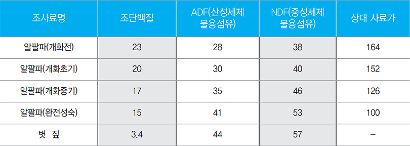 TMR Á¦Á¶¿¡ »ç¿ëµÇ´Â Á¶»ç·áÀÇ Ç°ÁúÀº ±â»óÁ¶°Ç, ¿¹Ãë ½Ã±â, ¼öÈ® ÈÄ º¸°ü»óÅ µî ¿©·¯ °¡Áö ¿äÀο¡ ÀÇÇØ ¿µÇâÀ» ¹Þ°Ô µÇ¹Ç·Î, Á¶»ç·á¸¦ ±¸ÀÔÇÒ ¶§´Â ¼ººÐ°ú °¡°ÝÀ» ºñ±³ÇÏ¿© ±¸ÀÔÇÏ¿©¾ß ÇÕ´Ï´Ù. <Ç¥4-2>¿¡¼ º¸´Â ¹Ù¿Í °°ÀÌ ¾ËÆÈÆÄ´Â ¿¹Ãë½Ã±â¿¡ µû¶ó Á¶´Ü¹éÁú ÇÔ·®Àº 23%¿¡¼ 15%±îÁö ´Ù¸£¸ç, NDF(Áß¼º¼¼Á¦ºÒ¿ë¼º¼¶À¯, Çì¹Ì¼¿·ç·Î½º, ¼¿·ç·Î½º, ¸®±×´ÑÀÌ ÁÖ¼ººÐ)´Â 38%¿¡¼ 55Á¤µµ±îÁö º¯ÈÇÏ°Ô µË´Ï´Ù. »ç·áÀÇ NDF ÇÔ·®ÀÌ ³·À»¼ö·Ï Á¥¼ÒÀÇ »ç·á ¼·Ãë·®Àº ¿Ã¶ó°¡°Ô µÇ¹Ç·Î, °í´É·Â¿ì¿¡ ÀÖ¾î¼ °¡°ÝÀÌ ºñ½Î´õ¶óµµ NDF ÇÔ·®ÀÌ ³·Àº ¾çÁúÀÇ Á¶»ç·á·Î TMRÀ» ¸¸µé¾î ±Þ¿©ÇØ¾ß ÇÕ´Ï´Ù.