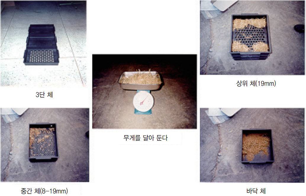 ¹Ì±¹ Ææ½Ç¹Ù´Ï¾Æ ´ëÇÐ ¿¬±¸ÆÀµéÀÌ »õ·Î¿î Á¶»ç·á ÀÔÀÚµµ ÃøÁ¤±â(Forage Particle Size Separator)¶ó´Â ü¸¦ ¸¸µé¾ú½À´Ï´Ù. ÀÌ Ã¼´Â 3´ÜÀ¸·Î µÇ¾î ÀÖÀ¸¸ç, »óÀ§ ü¿¡ Å« ±¸¸Û(19mm), Áß°£ ü¿¡ ÀÛÀº ±¸¸Û(8mm¡Â19mm<), ¹Ù´Ú ü´Â ±¸¸ÛÀÌ ¾ø´Â panÀ¸·Î ±¸¼ºµÇ¾î ÀÖ½À´Ï´Ù. ÀÌ Ã¼¿¡ ÀÏÁ¤·®ÀÇ »ùÇÃÀ» ¹«°Ô¸¦ ´Þ¾Æ¼ ³Ö°í Á¿ì·Î Èçµé¾î °¢ ü¿¡ ³²¾Æ ÀÖ´Â ºñÀ²À» °è»êÇÏ¿© °¡À̵å¶óÀο¡ ÀûÇÕÇÑÁö¸¦ ºñ±³ÇÏ´Â °ÍÀÔ´Ï´Ù.