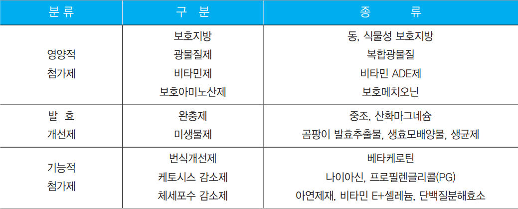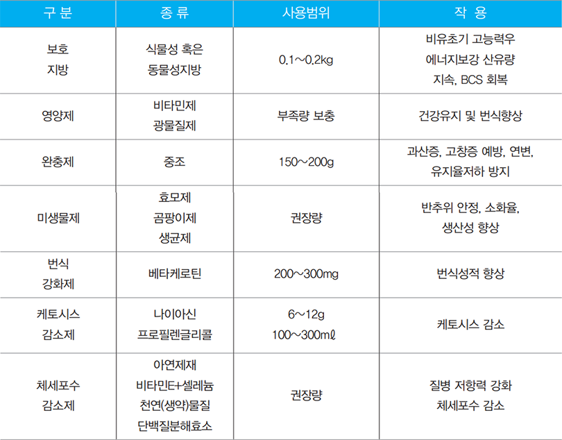 ÷°¡Á¦´Â ³óÈÄ»ç·á¿Í Á¶»ç·á¸¸À¸·Î °¡ÃàÀÇ ´É·ÂÀ» ÃæºÐÈ÷ ¹ßÈÖÇϱ⿡´Â ºÎÁ·ÇÒ ¶§ ÷°¡ÇÏ´Â ¹°Áú·Î¼, º¸Ãæ»ç·á ¶Ç´Â °úÇлç·á¶ó°í Çϸç, °úÇлç·á¿¡´Â ¹«±âÁú, ºñŸ¹Î·ù, ¾Æ¹Ì³ë»ê·ù, Ç×»ýÁ¦, »ý±ÕÁ¦, ¿ÏÃæÁ¦ µîÀÌ ÀÖ½À´Ï´Ù. TMR(¸ñÀå ¶Ç´Â °øÀå)¿¡¼ »ç¿ëÇÒ ¼ö ÀÖ´Â ÁÖ¿ä÷°¡Á¦·Î´Â Å©°Ô ¿µ¾çÀû ÷°¡Á¦(º¸È£Áö¹æ, Á¾ÇÕ¿µ¾çÁ¦, º¸È£¾Æ¹Ì³ë»ê)¿Í ¹ßÈ¿°³¼±Á¦(¼ÒÈÃËÁøÁ¦, ¿ÏÃæÁ¦), ±â´ÉÀû ÷°¡Á¦(¹ø½Ä°³¼±Á¦, ü¼¼Æ÷¼ö °¨¼ÒÁ¦) 3°¡Áö·Î ±¸ºÐÇÒ ¼ö Àִµ¥, ÷°¡Á¦ÀÇ »ç¿ë¸ñÀûÀº °í´É·Â¿ì ¿¡³ÊÁö º¸°À¸·Î »êÀ¯·® ÁõÁø ¹× BCS ȸº¹, ¹ÝÃßÀ§ ¹ßȿȯ°æ °³¼±À¸·Î ¼¶À¯¼Ò ¼ÒÈÀ̿뼺 ÁõÁø, ÇÏÀý±â °í¿Â½ºÆ®·¹½º °¨¼Ò, À¯Áö¹æ ÁõÁø µî À¯Áú°³¼±, ¹ø½ÄÈ¿À² °³¼±, ü¼¼Æ÷¼ö °¨¼Ò µîÀÔ´Ï´Ù. ÷°¡Á¦´Â ¸ñÀå¿¡ ¹®Á¦°¡ ¹ß»ýµÇÁö ¾Ê´Â ÇÑ Ç×»ó ±Þ¿©ÇؾßÇÒ Çʿ伺Àº ¾øÀ¸¸ç, ¸ñÀå¿¡¼ ¹®Á¦°¡ µÉ ¶§ »ç¾È¿¡ µû¶ó ¸ñÀû¿¡ ¸Â´Â ÷°¡Á¦¸¦ °³Ã¼º°·Î ±Þ¿©ÇÏ´Â °ÍÀÌ °¡Àå ¹Ù¶÷Á÷ÇÕ´Ï´Ù.