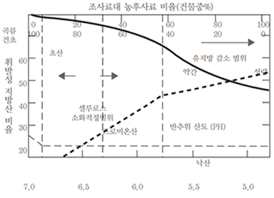 ³ó°¡¿¡¼ ±Þ¿©Çϰí ÀÖ´Â »ç·áÀÇ ÀûÁ¤ Á¶¡¤³óºñ´Â ¹ÝÃßÀ§ °Ç°À» À§ÇØ ÀûÀýÇÏ°Ô À¯ÁöµÇ¾î¾ß Çϳª ÀϹÝÀûÀ¸·Î ÃøÁ¤ÇÏ´Â ¹æ¹ýÀÌ ¾ø¾ú½À´Ï´Ù. Á¤»óÀûÀÎ ¼ÒµéÀº ¸ÅÀÏ 11~12½Ã°£ Á¤µµ ´©¿öÀÖ°Ô µÇ¸ç, °Ç°ÇÑ ¹ÝÃßÀ§¸¦ À¯ÁöÇϱâ À§ÇØ ¿ä±¸µÇ´Â Á¤»óÀûÀÎ ¹ÝÃ߽𣵵 ºñ½ÁÇÕ´Ï´Ù. µû¶ó¼ ÀûÁ¤ Á¶¡¤³óºñ¸¦ Á¡°ËÇÒ ¼ö ÀÖ´Â µÇ»õ±è Áö¼ö(Cud Chewing Index)¸¦ Ȱ¿ëÇÏ¿© »ç·á¸¦ ±Þ¿©ÇÏ´Â ÁöÇ¥·Î Ȱ¿ëÇÒ ¼ö ÀÖÀ¸¸ç, ÁÖ ³»¿ëÀº Ãà»ç³»¿¡ ÀÖ´Â ¼Ò Áß¿¡¼ ¹ÝÃßÇϰí ÀÖ´Â ¼ÒÀÇ ºñÀ²À» ÃøÁ¤ÇÔÀ¸·Î¼ Á¶¡¤³óºñ¸¦ ¸ð´ÏÅ͸µÇÒ ¼ö ÀÖ½À´Ï´Ù. ÃßõÇÏ´Â ÀûÁ¤µÇ»õ±è Áö¼ö´Â 60~65%ÀÔ´Ï´Ù.