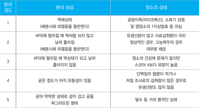»çÀ°ÁßÀÎ Á¥¼ÒÀÇ ºÐ »óŸ¦ º¸°í °Ç°»óÅÂ¿Í ¿µ¾ç»óŸ¦ ÆÇÁ¤ÇÏ´Â µ¥ Àû¿ëÇÒ ¼ö ÀÖ½À´Ï´Ù. ºÐÀÇ »ö±òÀº »ç·áÀÇ Á¾·ù³ª ´ãÁóÀÇ ³óµµ ±×¸®°í »ç·áÀÇ Åë°úÀ²¿¡ µû¶ó ¿µÇâÀ» ¹ÞÀ¸¸ç, ºÐÀÇ °æµµ ÁÖ·Î ºÐ³»ÀÇ ¼öºÐÇÔ·®¿¡ µû¶ó ´Þ¶óÁö´Âµ¥ ÀÌ´Â »ç·áÀÇ ¼öºÐÇÔ·®°ú µ¿¹°Ã¼³»¿¡ »ç·á°¡ ¸Ó¹°·¯ ÀÖ´Â ½Ã°£¿¡ µû¶ó ´Þ¶óÁý´Ï´Ù. ºÐÀÇ °æµµ¸¦ 1(¾ÆÁÖ ¹«¸§)~5(¸Å¿ì µüµüÇÔ)´Ü°è·Î ºÐ·ùÇÒ ¼ö ÀÖ½À´Ï´Ù. ¶ÇÇÑ ºÐÀÇ ³»¿ë¹°Àº Á¥¼Ò°¡ ¼·ÃëÇÑ »ç·á¿Í ¿µ¾ç¼ÒÀÇ ¼ÒÈ ¹× À̿뼺À» ³ªÅ¸³À´Ï´Ù.