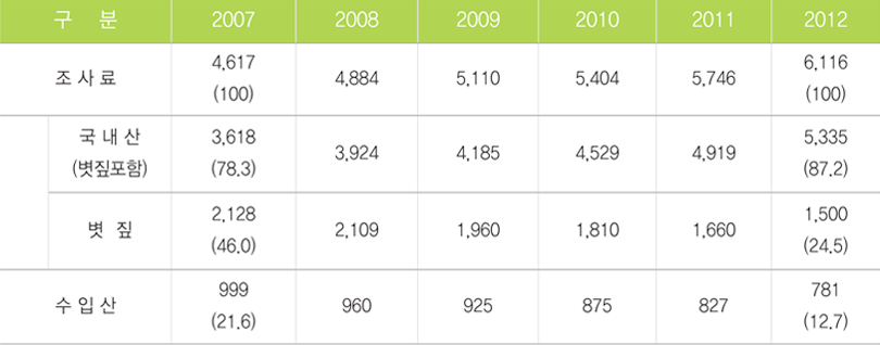 ¿ì¸®³ª¶óÀÇ Á¶»ç·á ¼ö¿ä·®À» »ìÆìº¸¸é <Ç¥5-1>¿¡¼ º¸´Â ¹Ù¿Í °°ÀÌ 2007³âµµ¿¡ ÃÑ 4,617ÃµÅæÀ¸·Î ÀÌ Áß ¼öÀÔ Á¶»ç·á°¡ 21.6%¸¦ Â÷ÁöÇϰí ÀÖÀ¸¸ç, ±¹³»»ê ¾çÁú Á¶»ç·á »ý»ê·®Àº 1,490ÃµÅæÀ¸·Î 25.9%¿¡ ºÒ°úÇÏ¸ç ³ª¸ÓÁö´Â º²Â¤(46%)À» ºñ·ÔÇÑ ºÎÁ¸»ç·áÀÚ¿øÀ» ÀÌ¿ëÇϰí ÀÖ´Â ½ÇÁ¤ÀÌ´Ù.