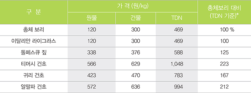 ±¹³»¿¡¼ »ý»êµÇ¾î À¯ÅëµÇ°í ÀÖ´Â ÃÑüº¸¸®¸¦ ±âÁØÀ¸·Î °¡°ÝÀ» ºñ±³ÇÏ¿© º¸¸é ¼öÀÔÁ¶»ç·á°¡ 2¹è ÀÌ»ó ºñ½Î°í, °î·ù»ç·á¿Í ¼öÀÔ °ÇÃʰ¡°ÝÀÌ »ó½ÂÇÒ¼ö·Ï ±× °ÝÂ÷´Â ´õ Ä¿Áú °ÍÀ¸·Î ¿¹ÃøÇϰí ÀÖ´Ù. Ç¥ 3¿¡¼ º¸¸é ÀÌÅ»¸®¾È ¶óÀ̱׶󽺳ª ÃÑüº¸¸®(TDN)º¸´Ù ¼öÀÔ °ÇÃÊ Áï Æ¼¸Ó½Ã, ±Í¸®, ¾ËÆÈÆÄ °ÇÃÊ µîÀÇ °¡°ÝÀÌ ³ôÀº °ÍÀ¸·Î ³ªÅ¸³µ´Ù.