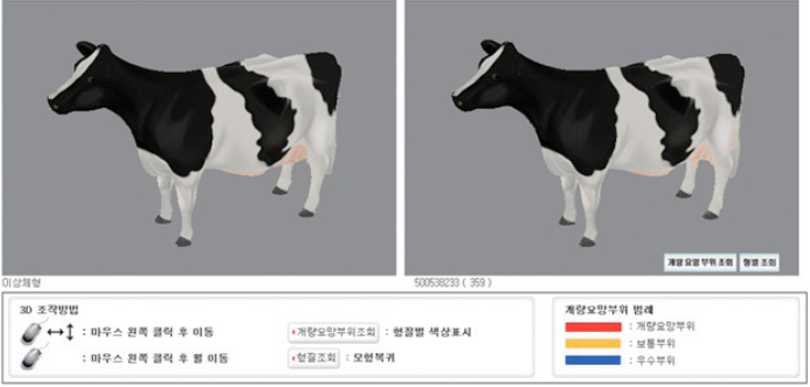 Á¥¼Ò ½É»çÁ¡¼ö¿¡ µû¶ó üÇüÀÇ ¸ð½ÀÀ» 3D¸¦ ÀÌ¿ëÇÏ¿© È®ÀÎÀÌ °¡´ÉÇÕ´Ï´Ù. °³·®ÀÌ ÇÊ¿äÇÑ ºÎÀ§¸¦ Ç¥½ÃÇÏ¿© üÇü°³·®À» ¿ëÀÌÇÏ°Ô ÇÏ¿´½À´Ï´Ù. ÀÌ ÇÁ·Î±×·¥Àº http://cow.nias.go.kr/·Î Á¢¼ÓÇÏ¿© »ç¿ëÇÏ½Ç ¼ö ÀÖ½À´Ï´Ù.