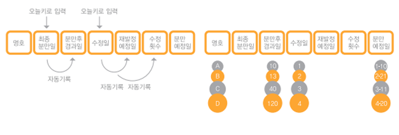Àü±¤ÆÇ½Ä ¹ø½Ä°ü¸® ½Ã½ºÅÛÀÇ ÇöȲÆÇ ±¸¼ºÀº °³Ã¼¹øÈ£, ºÐ¸¸ÀÏ, ºÐ¸¸ ÈÄ °æ°úÀϼö, Àΰø¼öÁ¤ÀÏ, Àç¹ßÁ¤ ¿¹Á¤ÀÏ, ºÐ¸¸ ¿¹Á¤ÀÏ, ¼öÁ¤È½¼ö, °ÇÀ¯ ¿¹Á¤ÀÏ, »êÂ÷·Î µÇ¾î ÀÖ´Ù. ºÐ¸¸ÀÏÀ» ±âÀÔÇÏ¸é ½ÃÀÏÀÌ °æ°úÇÏ´Â ¸¸Å ºÐ¸¸ ÈÄ °æ°úÀϼö°¡ ÀÚµ¿ÀûÀ¸·Î Ç¥½ÃµÇ°í, Àΰø¼öÁ¤ÀÏÀ» ±âÀÔÇϸé Àç¹ßÁ¤ ¿¹Á¤ÀÏÀÌ ÀÚµ¿ÀûÀ¸·Î Ç¥½ÃµÇ¸ç, ÀÓ½ÅÁø´ÜÀ¸·Î ÀÓ½ÅÀÌ È®À뵃 °æ¿ì °³Ã¼¹øÈ£¿¡ ¿Ã·Á ³õ°í <³¯Â¥ÀÔ·Â>¶ó´Â ۸¦ ´©¸£¸é ºÐ¸¸ ¿¹Á¤Àϰú °ÇÀ¯ ¿¹Á¤ÀÏÀÌ ÀÚµ¿ÀûÀ¸·Î Ç¥½ÃµÇ°Ô µË´Ï´Ù. ¼öÁ¤È½¼ö´Â Àΰø¼öÁ¤ÀÏÀ» ±âÀÔÇÒ ¶§¸¶´Ù ÀÚµ¿ÀûÀ¸·Î Ƚ¼ö°¡ ¿Ã¶ó°¡°Ô µÇ°í, »êÂ÷´Â ±âÀÔÀ» ÇÏ°Ô µÇ¾î ÀÖ½À´Ï´Ù. ¿©±â¼ ±âÀÔÇÏ´Â ¹æ¹ýÀº <³¯Â¥ÀÔ·Â>¶ó´Â ۸¦ ´©¸£¸é ¿À´Ã ³¯Â¥°¡ ÀÚµ¿À¸·Î ±âÀԵǵµ·Ï µÇ¾î ÀÖ½À´Ï´Ù.
