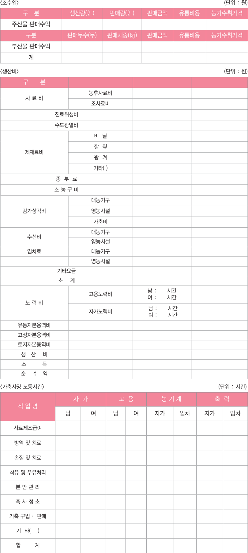 <Ç¥11-2>¡<Ç¥11-5>Àº ³ó°¡ÇöȲ, »çÀ°ÇöȲ, ´ë ³ó±â±¸ ¹× ½Ã¼³ÇöȲÀ» ±â·ÏÇÒ ¼ö ÀÖ´Â ´ëÀåÀ̸ç, ³ó°¡ÀÇ ÀÚ»êÇöȲ°ú °íÁ¤ÀÚº»ÀçÀÇ °¨°¡»ó°¢ÀÇ ±Ù°ÅÀÚ·á°¡ µË´Ï´Ù. <Ç¥11-6>¡<Ç¥11-7>Àº ¿ùº°·Î °æ¿µ¼º°ú¸¦ »êÃâÇϱâ À§Çؼ ¸ÅÀϸÅÀÏ ¹ß»ýÇÏ´Â ÆÇ¸ÅÇöȲ, ÆÇ¸Å±Ý¾×, À¯µ¿ºñ¿ë µîÀ» ±â·ÏÇÏ¿© Á¶¼öÀÔ°ú ÅõÀÔ»ç·á, ÀÚÀç ¹× ³ëµ¿ ÅõÀԽ𣠵îÀ» ÆÄ¾Ç ÇÒ ¼ö ÀÖ½À´Ï´Ù. À̸¦ ±âÃÊ·Î ÇÏ¿© <Ç¥11-8>Àº ¿ù¸»ÀÇ ¸Å¿ù Á¶¼öÀÔ ÇöȲ°ú °æ¿µºñ³»¿ëÀ» Áý°èÇÒ ¼ö ÀÖ½À´Ï´Ù.