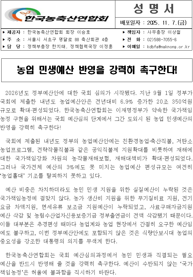 | ÷ºÎÆÄÀÏ | 251107 Çѱ¹³óÃà»ê¿¬ÇÕȸ ¼º¸í(³ó¾÷ ¹Î»ý¿¹»ê ¹Ý¿µÀ»...).pdf |