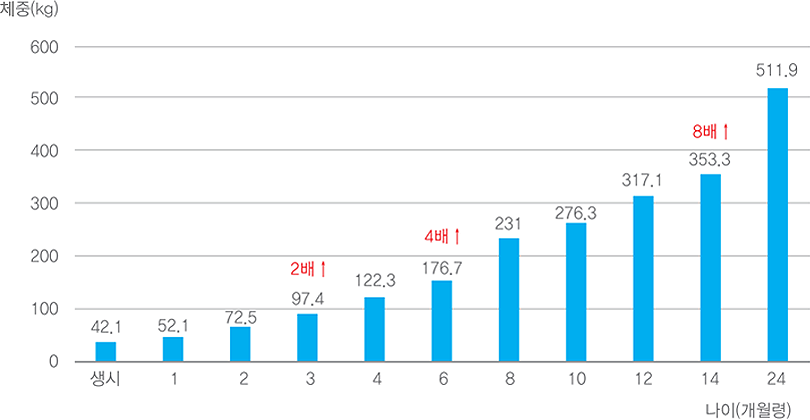 ¼Û¾ÆÁö°¡ žÀ» ¶§º¸´Ù 2¹è·Î ÀÚ¶ó´Âµ¥ ¼Ò¿äµÇ´Â Àϼö´Â ¾à 90ÀÏ ÀÔ´Ï´Ù. ¼Û¾ÆÁöÀÇ Ãâ»ý½Ã üÁßÀº Æò±Õ 42kg Á¤µµÀ̸ç, ¾Ï¼Û¾ÆÁö´Â 30¡45kg, ¼ö¼Û¾ÆÁö´Â 40¡60kg Á¤µµ·Î ÀϹÝÀûÀ¸·Î ¼ö¼Û¾ÆÁöÀÇ Ã¼ÁßÀÌ ´õ Å®´Ï´Ù. »ýÈÄ 3°³¿ùÀÌ µÇ¸é 2¹è ÀÌ»óÀ¸·Î ÀÚ¶ó°í 6°³¿ùÀÌ µÇ¸é 4¹è ÀÌ»ó, 4°³¿ùÀÌ µÇ¸é 8¹è ÀÌ»óÀ¸·Î ÀÚ¶ó Æò±Õ 350kg ÀÌ»óÀÇ Á¤»óÀûÀÎ ¾î¸¥¼Ò°¡ µË´Ï´Ù. ÀÌ·¸°Ô 14°³¿ù ÀÌ»óÀ̸ç üÁßÀÌ 350kg ÀÌ»óÀÎ ¼Ò¿¡°Ô´Â ¼ºÀûÀ¸·Î ¼º¼÷µÈ ¾î¸¥¼ÒÀÇ ÀÚ°ÝÀ» ÁÖ¾î ÀÓ½ÅÀ» ½ÃŰ°Ô µË´Ï´Ù.