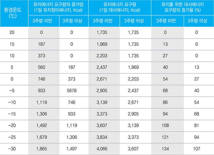 ¼Û¾ÆÁö´Â üÁö¹æÀ̳ª ÇǸ𰡠ºó¾àÇÑ »óÅ·Πž´Ï´Ù. µû¶ó¼ ±Ø½ÉÇÑ ÃßÀ§ Á¶°Ç¿¡¼ ¼Û¾ÆÁö°¡ ü³» ºñÃà¿¡³ÊÁö·Î °ßµô ¼ö ÀÖ´Â ½Ã°£Àº ÇÏ·ç ¹Ì¸¸ÀÔ´Ï´Ù. °¡ÃàÀÇ Ç¥ÁØ ¿¡³ÊÁö¿ä±¸·®Àº ¿ Á߸³ ȯ°æ¿¡¼ ÃøÁ¤µÈ ¿¡³ÊÁö À̵¿·®À» ±âÁØÀ¸·Î Á¦Á¤ÇÑ °ÍÀ̱⠶§¹®¿¡ ÀÌ·¯ÇÑ È¯°æÁ¶°Ç¿¡¼´Â ü½ÉºÎ ¿Âµµ¸¦ À¯ÁöÇϱâ À§ÇÑ ¿º¸Á¸ ¹× ¿¼Õ½ÇÀÇ Çʿ䰡 ¹ß»ýÇÏÁö ¾Ê´Â´Ù°í ÇÕ´Ï´Ù. ÀÌ¿Í °°Àº ¿ Á߸³´ë´Â ¿©·¯ ¿äÀο¡ ÀÇÇÏ¿© º¯µ¿µÉ ¼ö Àִµ¥, ±× Áß Áß¿äÇÑ ¿ä¼Ò°¡ ¿¬·É¡¤»ç·á¼·Ãë ¼öÁØ¡¤ÇÇÇÏÁö¹æÀÇ ¾ç ±×¸®°í ÇǸðÀÇ µÎ²² µîÀÔ´Ï´Ù. ¸Å¿ì ¾î¸° ¼Û¾ÆÁöµéÀÇ ¿ Á߸³±ÇÀº 15¡É~25¡É·Î ¾Ë·ÁÁ® Àִµ¥, ȯ°æ¿Âµµ°¡ ¼Û¾ÆÁöÀÇ ÇÏÇÑ ÀÓ°è¿ÂµµÀÎ 15¡ÉÀÌÇÏ·Î ¶³¾îÁú °æ¿ì, ¼Û¾ÆÁö°¡ ü¿ÂÀ» À¯ÁöÇÏ·Á¸é ¹Ýµå½Ã ¿¡³ÊÁö¸¦ Ãß°¡·Î ¼ÒºñÇÏ¿©¾ß ÇÔÀ» À¯³äÇØ¾ß ÇÕ´Ï´Ù. À̰ÍÀº ¼Û¾ÆÁöÀÇ À¯Áö¿¡³ÊÁö ¿ä±¸·®ÀÇ Áõ°¡¸¦ ÀǹÌÇÕ´Ï´Ù. ±×·¯³ª ¼Û¾ÆÁöÀÇ ¿¬·ÉÀÌ ¸¹¾ÆÁö°Å³ª »ç·á¸¦ ´õ ¸ÔÀº °æ¿ì¿¡´Â ÇÏÇÑ ÀÓ°è¿Âµµ°¡ -5¡É³»Áö -10¡É±îÁö ³»·Á°¥ ¼ö ÀÖ½À´Ï´Ù.