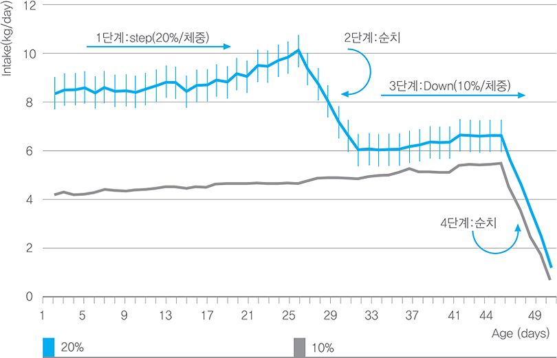ÀÌ·¯ÇÑ ¼Û¾ÆÁöÀÇ ÀÌÀ¯½Ã »ç·á½ºÆ®·¹½º¸¦ ÃÖ¼ÒÈÇϱâ À§ÇÑ ¹æ¹ýÀÌ °³¹ßµÇ¾ú´Âµ¥, À̰ÍÀº ¼Û¾ÆÁö ÀÌÀ¯½ºÆ®·¹½º ÃÖ¼Òȸ¦ ÅëÇÑ °°ÇÇÑ ¼Û¾ÆÁö À°¼ºÀÇ »õ·Î¿î ¹æ¹ýÀ¸·Î½á °³Ã¼º° Á¤¹Ð°¨·® Æ÷À¯¹ýÀ̶ó°í ÇÕ´Ï´Ù. ÀÌ Æ÷À¯¹æ¹ýÀº ¨ç1´Ü°è(ÃÖ´ë±Þ¿©±â) : Æ÷À¯ ÃʱâºÎÅÍ 25ÀϷɱîÁö´Â ÇÏ·ç 6ȸ ÀÌ»ó 12ȸ ±îÁö Æ÷À¯È½¼ö¸¦ ´Ã·Á üÁßÀÇ 20%±îÁö Æ÷À¯·®À» Áõ°¡ÇÏ¿© ÃÖ´ë¼·Ãë·®À» ÅëÇÑ ÃæºÐÇÑ ¿µ¾ç°ø±ÞÀ¸·Î ÃÊ±â Æ÷À¯±â ´Ü°è¿¡¼ÀÇ °°ÇÇÑ ¼Û¾ÆÁö ¸¸µé±â ¨è2´Ü°è(Á¡Áø°¨·®±â) : ÀÌÀ¯½Ä ÈÆ·Ã ÇÁ·Î±×·¥À¸·Î½á Á¶±Ý¾¿ ÀÏÀÏ °¨·® ÈÄ 30ÀϷɺÎÅʹ üÁßÀÇ 10%·Î Æ÷À¯·®À» ¹ÝÀ¸·Î ÁÙÀÓÀ¸·Î½á »ó´ëÀû °øº¹°¨À» À¯µµÇÏ¿© ´Ù¸¥ ¸ÔÀÌ Áï, °íÇâ»ç·á ¼·Ãë·® Áõ°¡¸¦ À¯µµÇÏ´Â ¹æ¹ýÀ¸·Î µÇ¾î ÀÖ½À´Ï´Ù.
