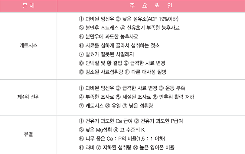 ÈÄ»êÁ¤Ã¼ÀÇ ¿øÀÎÀº ¼¿·¹´½, ±¸¸®, ¿äµå, ÀÎ, ´Ü¹éÁú, ¿¡³ÊÁö, ºñŸ¹Î A ¹× ºñŸ¹Î EÀÇ ºÎÁ·À̸ç, ¿¡³ÊÁö¿Í Ä®·ýÀÇ °úÀ×µµ ¿øÀÎÀÌ µË´Ï´Ù. ¿¬°ü Áúº´Àº À¯¿°ú ÄÉÅä½Ã½ºÀÔ´Ï´Ù. ±×¸®°í À¯¹æÀÇ ºÎÁ·Áõ¼¼´Â ´Ü¹éÁú°ú ¸¶±×³×½·ÀÇ °áÇÌ È¤Àº ³ªÆ®·ýÀ̳ª Ä®·ýÀÇ °úÀ×ÀÌ ¿øÀÎÀÔ´Ï´Ù. ÄÉÅä½Ã½º´Â ¿¡³ÊÁö¿Í ´Ü¹éÁúÀÇ °áÇÌÀÌ ¿øÀÎÀ̸ç, À¯º°, ÈÄ»êÁ¤Ã¼ ¹× ÀüÀ§Áõ°ú ¿¬°ü¼ºÀÌ ³ô½À´Ï´Ù. Á¦4À§ ÀüÀ§ÁõÀº Á¶¼¶À¯ÀÇ ºÎÁ·°ú ³óÈÄ»ç·á(¿¡³ÊÁö)ÀÇ °ú´Ù±Þ¿©°¡ ¿øÀÎÀÌ µÇ¸ç, À¯¿, ÄÉÅä½Ã½º ¹× À¯¹æ¿°°ú ¿¬°ü¼ºÀÌ ¸Å¿ì ³ô½À´Ï´Ù.