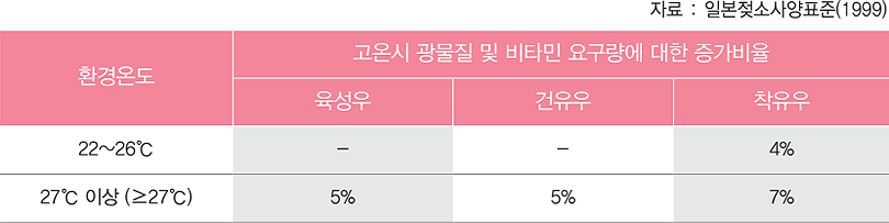 ARCÇ¥Áذú NRCÇ¥ÁØ¿¡¼µµ °í¿Â ½Ã¿¡ Á¥¼ÒÀÇ K ¿ä±¸·® ¹× ºñŸ¹Î ¿ä±¸·®ÀÌ Áõ°¡ÇÏ¿©¾ß µÈ´Ù°í ÇÕ´Ï´Ù. ÀϺ»Á¥¼Ò»ç¾çÇ¥ÁØ¿¡¼´Â °í¿Â ½Ã¿¡ Á¥¼ÒÀÇ ±¤¹°Áú ¿ä±¸·®À» <Ç¥2-11>¿¡ ³ªÅ¸³½ ¹Ù¿Í °°ÀÌ Àû¿Â ȯ°æÇÏ¿¡¼ÀÇ ±¤¹°Áú ¿ä±¸·®º¸´Ùµµ »ç·á Áß¿¡ ÇÔ·®À» ³ô¿© ±Þ¿©ÇÏ´Â °ÍÀ» ±ÇÀåÇϰí ÀÖ½À´Ï´Ù.