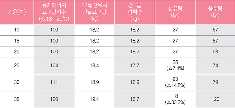ÀϹÝÀûÀ¸·Î Á¥¼ÒÀÇ °í¿Â½ÃÀÇ ±¤¹°Áú ¿ä±¸·®Àº Àû¿Â½ÃÀÇ ¿ä±¸·®º¸´Ùµµ Áõ°¡ÇÕ´Ï´Ù. Àû¿Â ½Ã¿¡ Á¥¼ÒÀÇ ±¤¹°Áú ¹è¼³ °æ·Î´Â ÁÖ·Î ºÐ´¢ÀÌÁö¸¸, °í¿Â½Ã¿¡´Â ºÐ´¢À̿ܿ¡ ¹ßÇÑ, Å»¸ð ¹× Ÿ¾×ºÐºñ·Î ±¤¹°Áú ¹è¼³·®Àº Áõ°¡ÇÕ´Ï´Ù. ƯÈ÷ °í¿Â½Ã¿¡´Â ¹ßÇÑ È¤Àº Ÿ¾×¿¡ ÀÇÇÑ K ¹× Na ¹× ºñŸ¹Î ¼Õ½Ç·®ÀÌ ´ë´ÜÈ÷ ¸¹´Ù´Â °ÍÀÌ ¾Ë·ÁÁ® ÀÖ½À´Ï´Ù. °í¿Â½ºÆ®·¹½º°¡ Á¥¼ÒÀÇ ±¤¹°Áú ´ë»ç¿¡ ¹ÌÄ¡´Â ¿µÇâÀ¸·Î´Â »ç·á¼·Ãë·®ÀÇ °¨¼Ò¿¡ µû¸¥ ±¤¹°Áú ¼·Ãë·®ÀÇ °¨¼Ò°¡ °¡Àå Å©Áö¸¸, ±× ¿µÇâÀº ÂøÀ¯¿ì¿¡°Ô ƯÈ÷ ÇöÀúÇÕ´Ï´Ù. °í¿Â½Ã¿¡ Á¥¼ÒÀÇ ±¤¹°Áú ¹× ºñŸ¹Î ¼·Ãë·®ÀÌ °¨¼ÒÇÏ¸é ¼ÒȰüÀ¸·ÎºÎÅÍÀÇ ±¤¹°Áú ¹× ºñŸ¹Î Èí¼ö·®µµ °¨¼ÒÇÕ´Ï´Ù. Á¥¼ÒÀÇ À¯Áö¿¡ ÇÊ¿äÇÑ ±¤¹°Áú ¹× ºñŸ¹Î ¿ä±¸·®Àº 27¡ÉÀÌ»óÀÌ µÇ¸é °í¿Â½Ãº¸´Ùµµ ¾à 10%Á¤µµ Áõ°¡ÇÕ´Ï´Ù. ¿ìÀ¯ Áß Ca, P, Mg ¹× Na ÇÔ·®Àº 22¡ÉÀÌ»óÀÌ µÇ¸é Àû¿Â½Ãº¸´Ù ¾à 5~8% ÀúÇÏ ÇÏÁö¸¸, ¿ìÀ¯ Áß ´Ù¸¥ ±¤¹°Áú ÇÔ·®Àº °í¿Â½ºÆ®·¹½º¿¡ ÀÇÇÑ ¿µÇâÀ» °ÅÀÇ ¹ÞÁö ¾Ê½À´Ï´Ù. °í¿Â½Ã¿¡ ¿ìÀ¯ Áß Ca, P ¹× Mg ÇÔ·®ÀÇ ÀúÇÏ´Â ¼ÒȰüÀ¸·ÎºÎÅÍÀÇ Èí¼ö·® °¨¼Ò¿Í ü³»·ÎºÎÅÍ ±âÀÎÇÑ Ca, P ¹× MgÀÇ ¼Õ½Ç·® Áõ°¡·Î ü³»¿¡¼ ºñÀ¯¸¦ À§ÇØ ÀÌ¿ëµÉ ¼ö ÀÖ´Â Ca, P ¹× MgÀÇ ¾çÀÌ °¨¼ÒÇÑ °Í¿¡ °ü°è°¡ ±í½À´Ï´Ù.