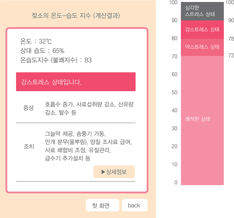 °è»ê¡°¿¹¡±¸¦ »ìÆìº¸¸é, ¿Âµµ 32¡É, ½Àµµ 65%¸¦ ÀÔ·ÂÇÏ¿´À» ¶§ ÀÚµ¿À¸·Î °è»êµÈ ºÒÄèÁö¼ö(THI) °á°úÄ¡°¡ 83ÀÓÀ» º¸¿© ÁÖ°í ÀÖ½À´Ï´Ù. THI(ºÒÄèÁö¼ö)°¡ 72~78ÀÌ¸é ¾à½ºÆ®·¹½º, 79~89ÀÌ¸é °½ºÆ®·¹½º, 90~98ÀÌ¸é ½É°¢ÇÑ »óÅÂ, 99 ÀÌ»óÀÌ¸é Æó»ç¿¡ À̸£°Ô µÈ´Ù°í ÇÕ´Ï´Ù. Áï ¼ÒµéÀº THI(ºÒÄèÁö¼ö)°¡ 72 ÀÌ»óÀÌ¸é ¼ÒµéÀº °í¿Â½ºÆ®·¹½º¸¦ ´À³¢±â ½ÃÀÛÇÑ´Ù´Â °ÍÀÔ´Ï´Ù. ¿Â½Àµµ Áö¼öº° »ç¾ç°ü¸®½Ã Âü°íÀÚ·á´Â <Ç¥2-7>°ú °°½À´Ï´Ù.