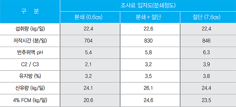 »êÀ¯·®ÀÌ ¸¹Àº Á¥¼Ò´Â ºñ±³Àû ¸¹Àº ³óÈÄ»ç·á¸¦ ¸Ô°Ô µÇ´Âµ¥, ¼ÒµéÀÌ ÀûÀýÇÑ ¹ÝÃßÀ§ ±â´ÉÀ» À¯ÁöÇϱâ À§Çؼ´Â »ç·á³» Àû´çÇÑ ¼¶À¯¼Ò°¡ ÀÖ¾î¾ß ÇÕ´Ï´Ù. ¸¸¾à ¼ÒµéÀÌ ÃÖÀú Á¶¼¶À¯ ¼öÁØÀ» ÃæÁ·ÇÏÁö ¸øÇϸé, ¼ÒµéÀº Á¾Á¾ ´ë»ç¼º Áúº´, ÃÑ °Ç¹° ¼ÒÈÀ² °¨¼Ò, À¯ÁöÀ² °¨¼Ò, Á¦4À§ ÀüÀ§, ¹ÝÃßÀ§ ºÎÀü°¢ÈÁõÀÇ ¹ßº´ÀÇ Áõ°¡, Á¦¿±¿°, °ú»êÁõ, °úºñ ÁõÈıº µîÀ» º¸ÀÌ°Ô µË´Ï´Ù. TMR ³» Á¶»ç·á ÀÔÀÚÅ©±â°¡ ÀÛÀ¸¸é ÀúÀ۽𣠰¨¼Ò, ¹ÝÃßÀ§ »êµµ ÀúÇÏ µîÀÇ Çö»ó º¸ÀÌ°Ô µÇ¸ç, ÀúÀ۽ð£ÀÌ °¨¼ÒÇÏ¸é ¹ÝÃßÀ§ ÁßÈ¿¡ ÇÊ¿äÇÑ Ä§ »ý»ê·® °¨¼ÒÇϰí, ºÒÃæºÐÇÑ ÀÔÀÚ Å©±â´Â ¹ÝÃßÀ§³» ÃÊ»ê°ú ÇÁ·ÎÇÇ¿Â»ê ºñÀ² °¨¼Ò, pH ÀúÇÏ·Î À¯ÁöÀ² ÀúÇϰ¡ ÀϾ´Ï´Ù. Ä®³¯ÀÌ ´Þ¸° È¥Çձ⳪ ºÐ¹è±â´Â ½Ã°£ÀÇ °æ°ú¿¡ µû¶ó »ç·á³ª Á¶»ç·áÀÇ ÀÔÀÚµµ¸¦ °¨¼Ò½Ãų ¼ö ÀÖÀ¸¹Ç·Î TMR Á¦Á¶½Ã È¥Çսð£À» Àß Á¶Á¤ÇØ¾ß ÇÕ´Ï´Ù.