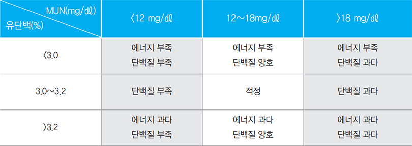 ¿ìÀ¯Áß¿¡ ÇÔÀ¯µÈ ¿ä¼ÒÅ Áú¼ÒÀÇ ³óµµ(MUN ; Milk Urea Nitrogen)´Â À¯´Ü¹éÁú ³óµµ¿Í ÇÔ²² ÂøÀ¯¿ì¿¡ ´ëÇÑ ´Ü¹éÁú°ú ¿¡³ÊÁö °ø±Þ»óŸ¦ °£Á¢ÀûÀ¸·Î ÆÇ´ÜÇϴµ¥ ¸Å¿ì À¯¿ëÇÑ Á¤º¸·Î Ȱ¿ëµÉ ¼ö ÀÖ½À´Ï´Ù. °¢ ¸ñÀå¿¡¼´Â Á¥¼Ò ´É·Â°ËÁ¤»ç¾÷¿¡ Âü¿©ÇÏ¿© Á¤±âÀûÀÎ MUN Á¤º¸¸¦ ¹Þ¾Æº½À¸·Î¼ ±Þ¿©Çϰí ÀÖ´Â TMR»ç·áÀÇ ¿µ¾ç¼Ò ÇÔ·®À» ÃßÁ¤ÇÒ ¼ö ÀÖÀ¸¸ç °³Ã¼º° ¶Ç´Â Àüü ¿ì±ºº° MUN º¯È¾ç»óÀ» °üÂûÇÔÀ¸·Î½á º¸´Ù ÇÕ¸®ÀûÀÎ »ç¾ç°ü¸® ¸ñÇ¥¸¦ ¼¼¿ö °Ç°ÇÑ Ã౺À» À¯ÁöÇÒ ¼ö ÀÖµµ·Ï ÇØ¾ß¸¸ ÇÕ´Ï´Ù. ÀûÁ¤ MUN ¼öÁØÀº ¿ìÀ¯ 1d§¤´ç 12~18§·À̸ç ÀÌ º¸´Ù ³ô°Å³ª ³·À» °æ¿ì »ç·áÁß ¿¡³ÊÁö¿Í ´Ü¹éÁú ±ÕÇüÀÌ ÀûÇÕÇÏÁö ¾ÊÀ¸¹Ç·Î TMR ¹èÇÕºñ¸¦ Á¶ÀýÇØ ÁÙ Çʿ䰡 ÀÖ½À´Ï´Ù.