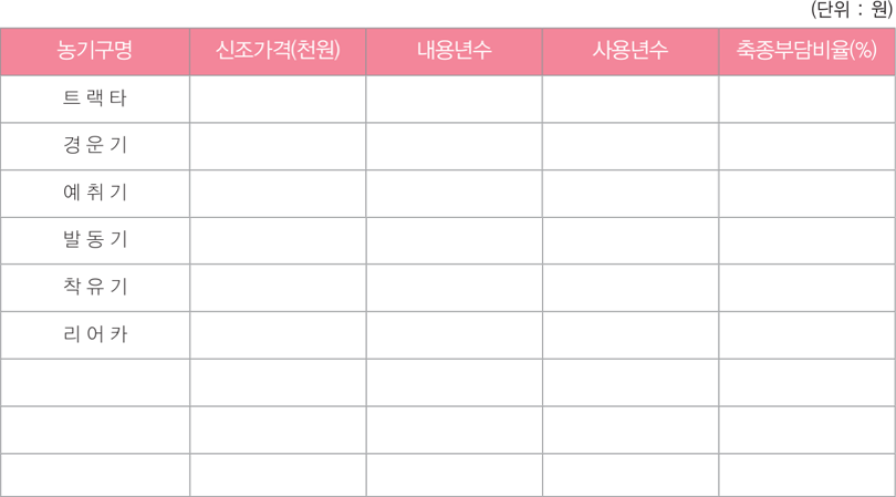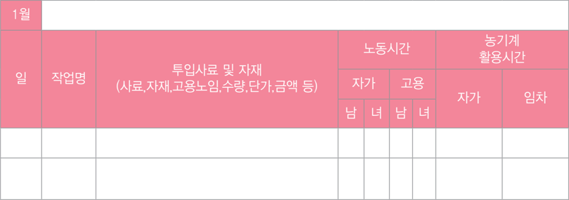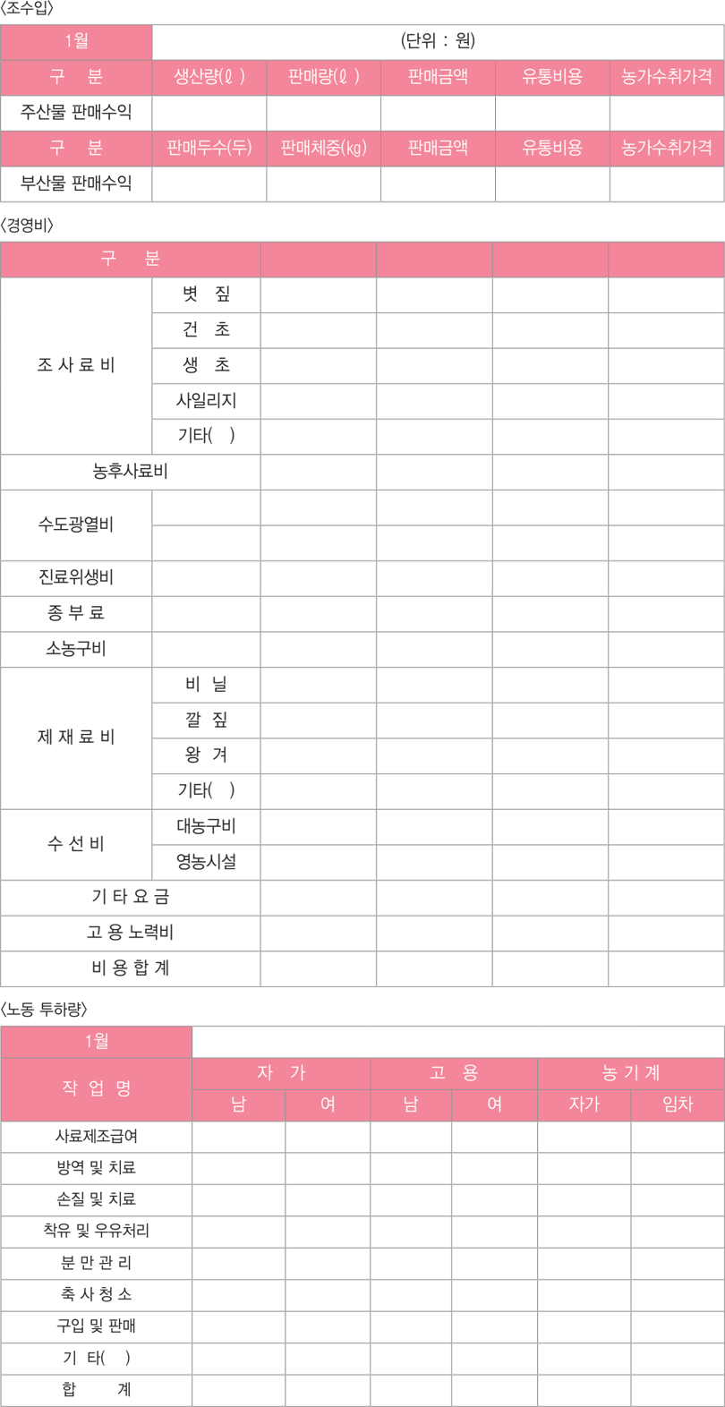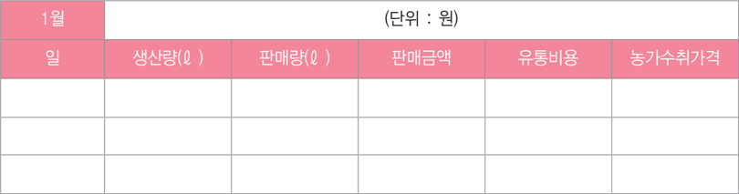 <Ç¥11-2>¡<Ç¥11-5>Àº ³ó°¡ÇöȲ, »çÀ°ÇöȲ, ´ë ³ó±â±¸ ¹× ½Ã¼³ÇöȲÀ» ±â·ÏÇÒ ¼ö ÀÖ´Â ´ëÀåÀ̸ç, ³ó°¡ÀÇ ÀÚ»êÇöȲ°ú °íÁ¤ÀÚº»ÀçÀÇ °¨°¡»ó°¢ÀÇ ±Ù°ÅÀÚ·á°¡ µË´Ï´Ù. <Ç¥11-6>¡<Ç¥11-7>Àº ¿ùº°·Î °æ¿µ¼º°ú¸¦ »êÃâÇϱâ À§Çؼ ¸ÅÀϸÅÀÏ ¹ß»ýÇÏ´Â ÆÇ¸ÅÇöȲ, ÆÇ¸Å±Ý¾×, À¯µ¿ºñ¿ë µîÀ» ±â·ÏÇÏ¿© Á¶¼öÀÔ°ú ÅõÀÔ»ç·á, ÀÚÀç ¹× ³ëµ¿ ÅõÀԽ𣠵îÀ» ÆÄ¾Ç ÇÒ ¼ö ÀÖ½À´Ï´Ù. À̸¦ ±âÃÊ·Î ÇÏ¿© <Ç¥11-8>Àº ¿ù¸»ÀÇ ¸Å¿ù Á¶¼öÀÔ ÇöȲ°ú °æ¿µºñ³»¿ëÀ» Áý°èÇÒ ¼ö ÀÖ½À´Ï´Ù.